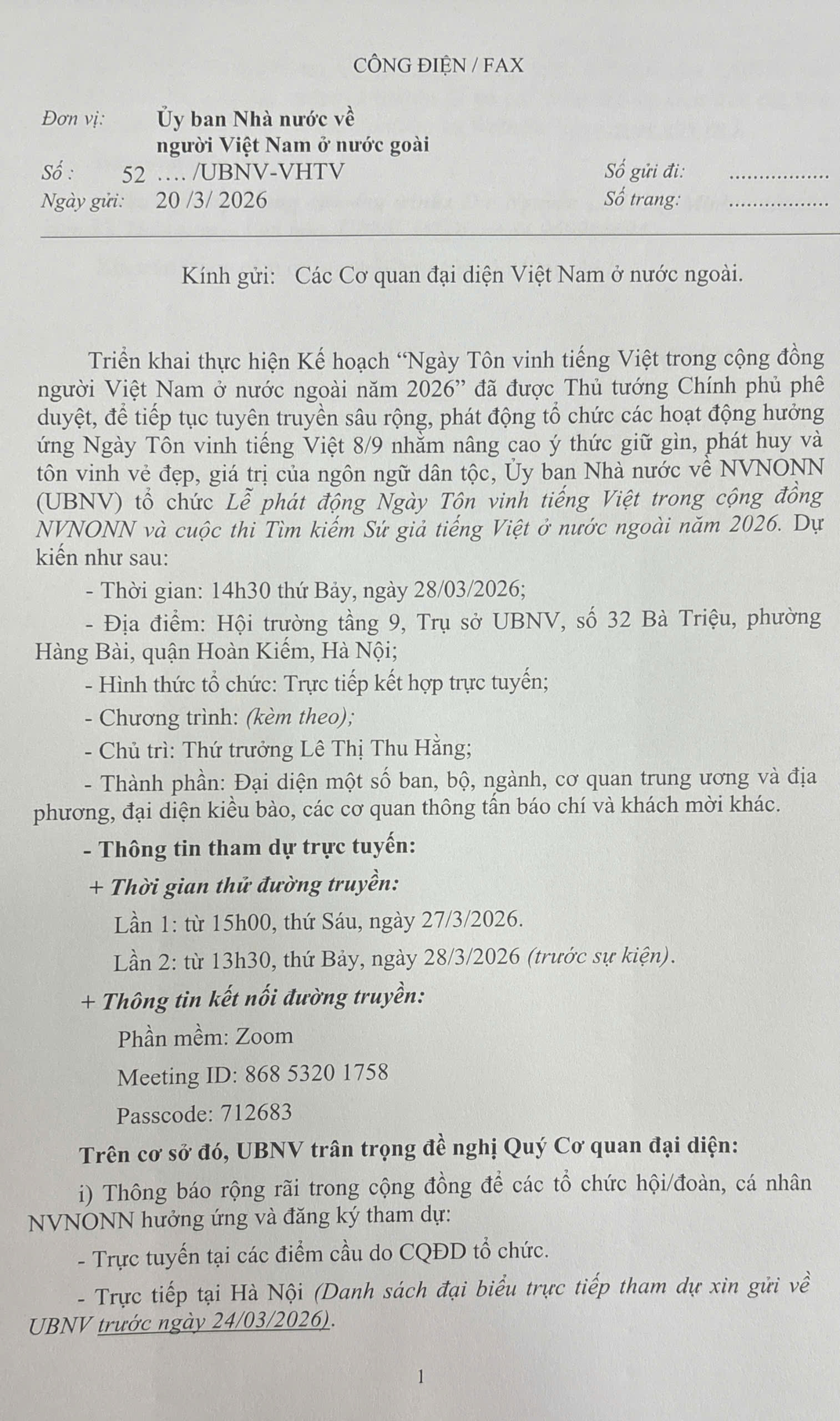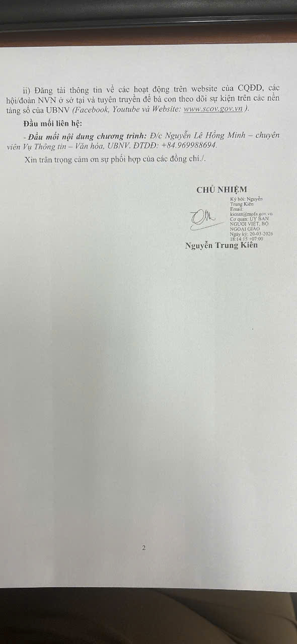 Về việc tham dự Lễ phát động “Ngày Tôn vinh tiếng Việt trong cộng đồng người Việt Nam ở nước ngoài năm 2026”